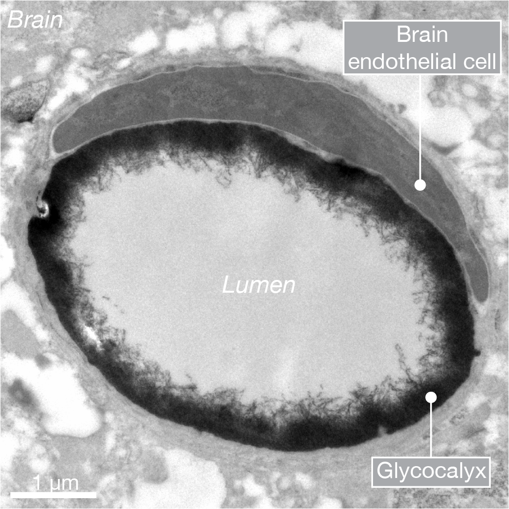 Transmission electron micrograph of mouse brain capillary. Glycocalyx visualized via lanthanum deposition on vessel lumen.